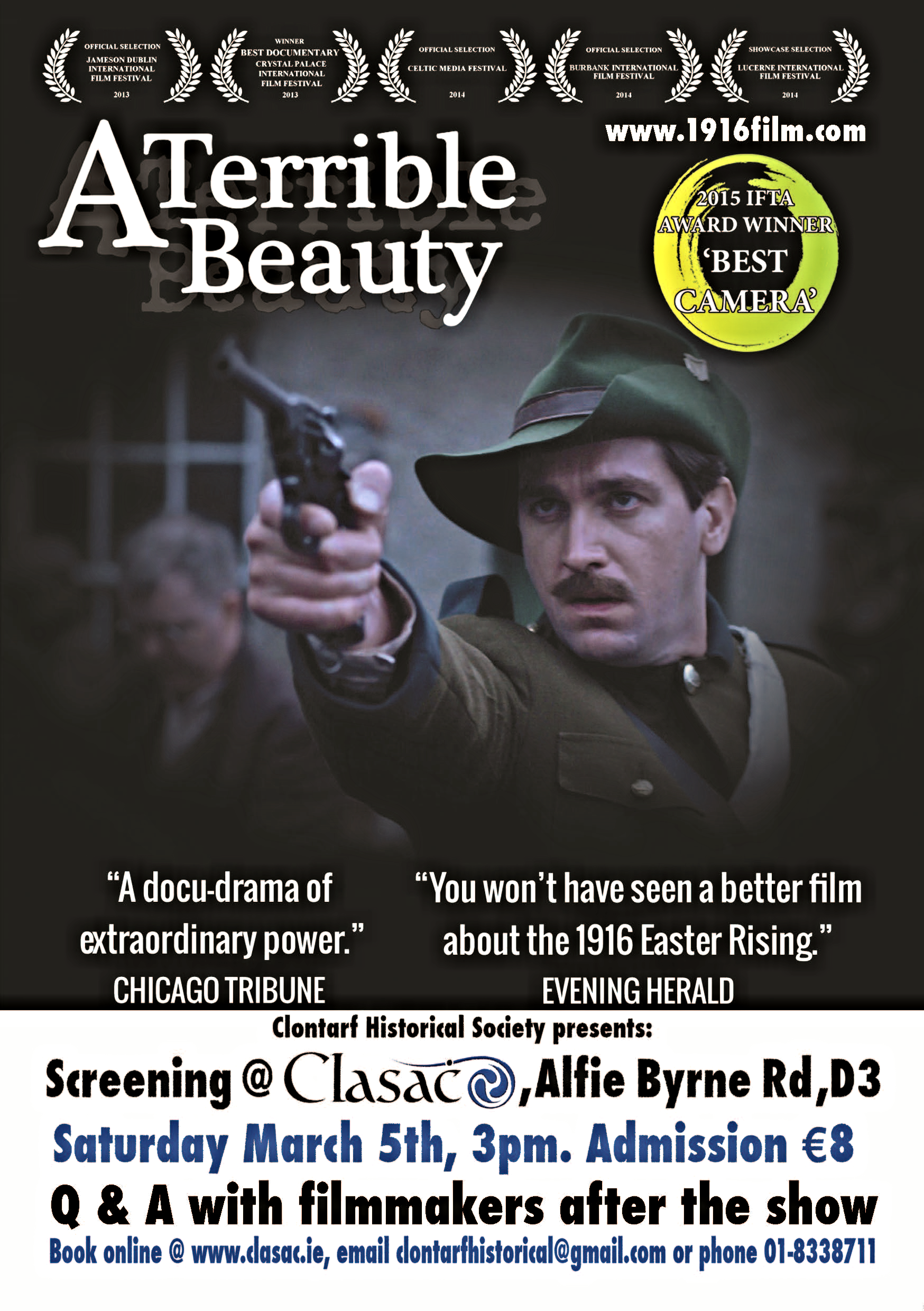 16/02/16 - On Saturday March 5th, the Clontarf Historical Society will host a screening of 'A Terrible Beauty' at the Clasac Building on the Alfie Byrne Road in Clontarf (3pm). Tickets to the show are €8 and can be bought in advance at www.clasac.ie, by emailing clontarfhistorical@gmail.com or phone 01-8338711. After the show, we will be on hand to answer any questions.